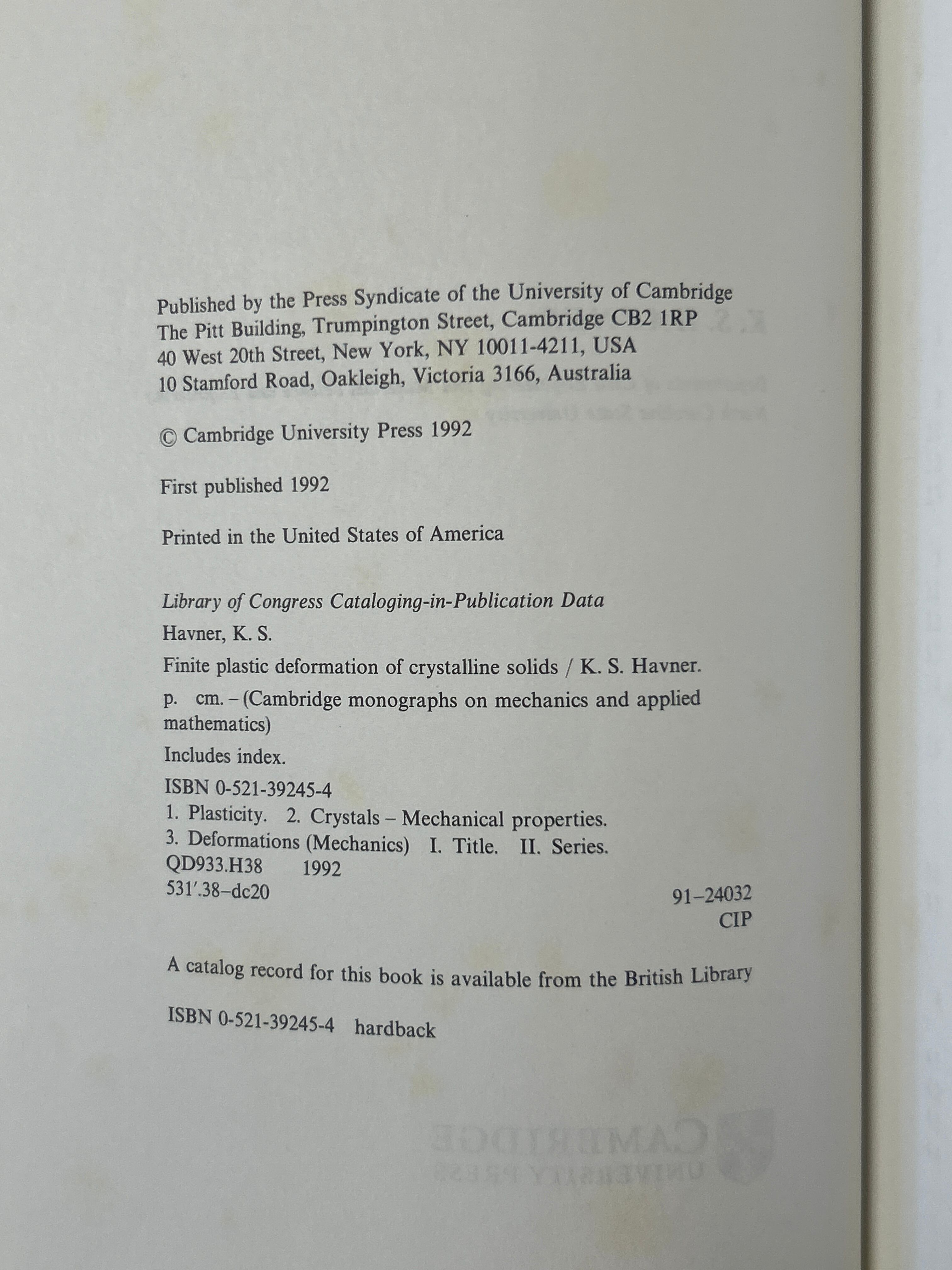 Finite Plastic Deformation of Crystalline Solids. (Cambridge Monographs on Mechanics and Applied Mathematics) /HAVNER(K.S)〈34854〉