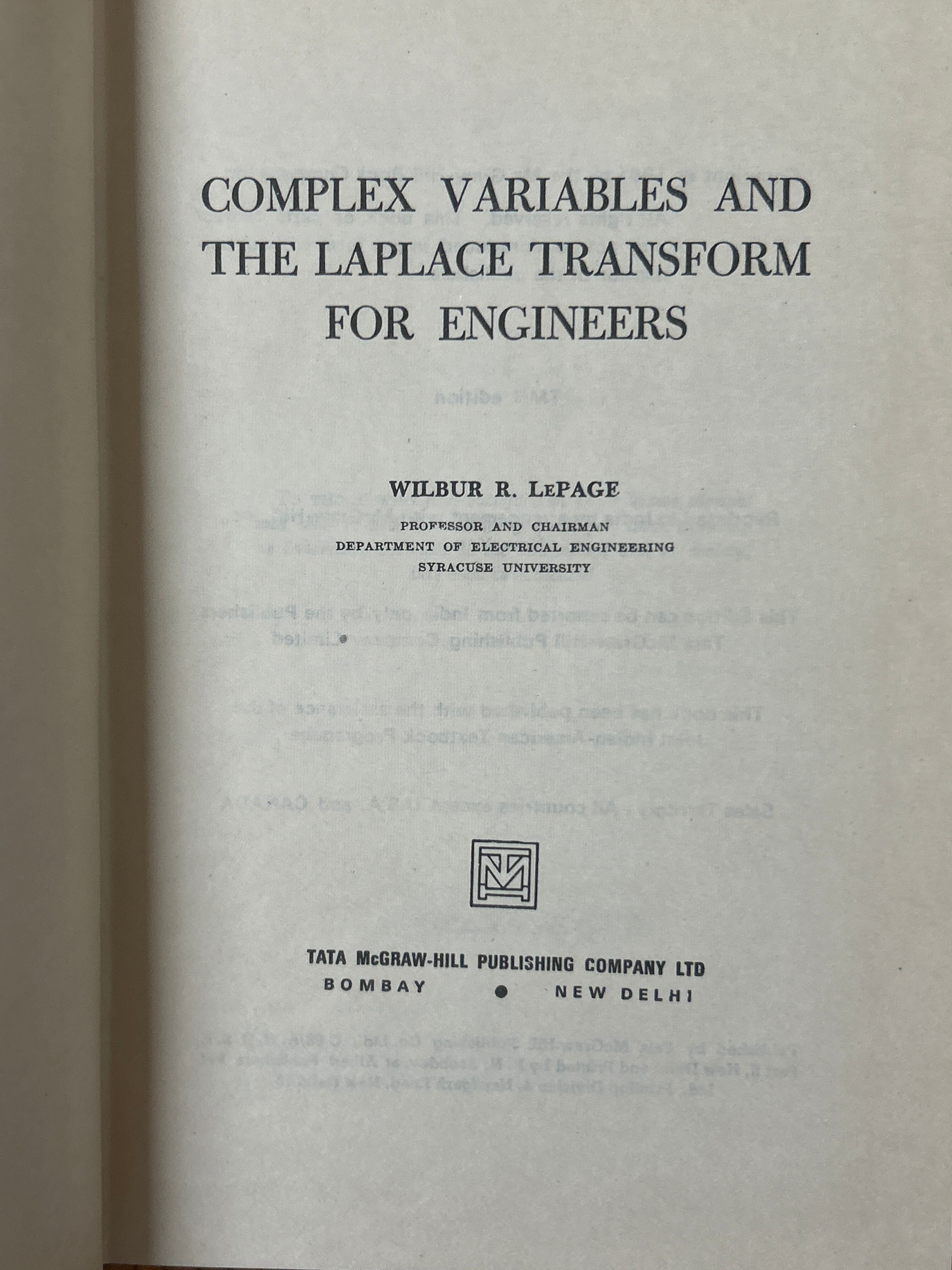 Complex Variables and The Laplace Transform for Engineers. /LePAGE(W.R)〈40595〉
